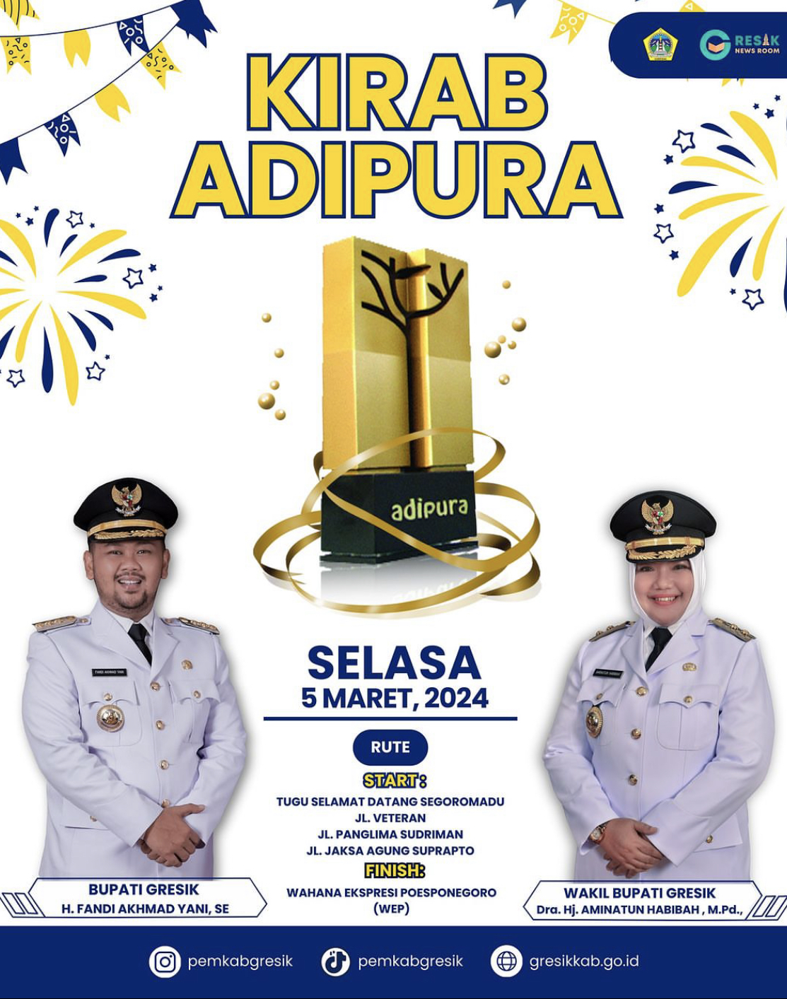 Dalam postingan instagram @pemkabgresik, Piala Adipura akan dikirab keliling kota, sore ini, Selasa (5/3).