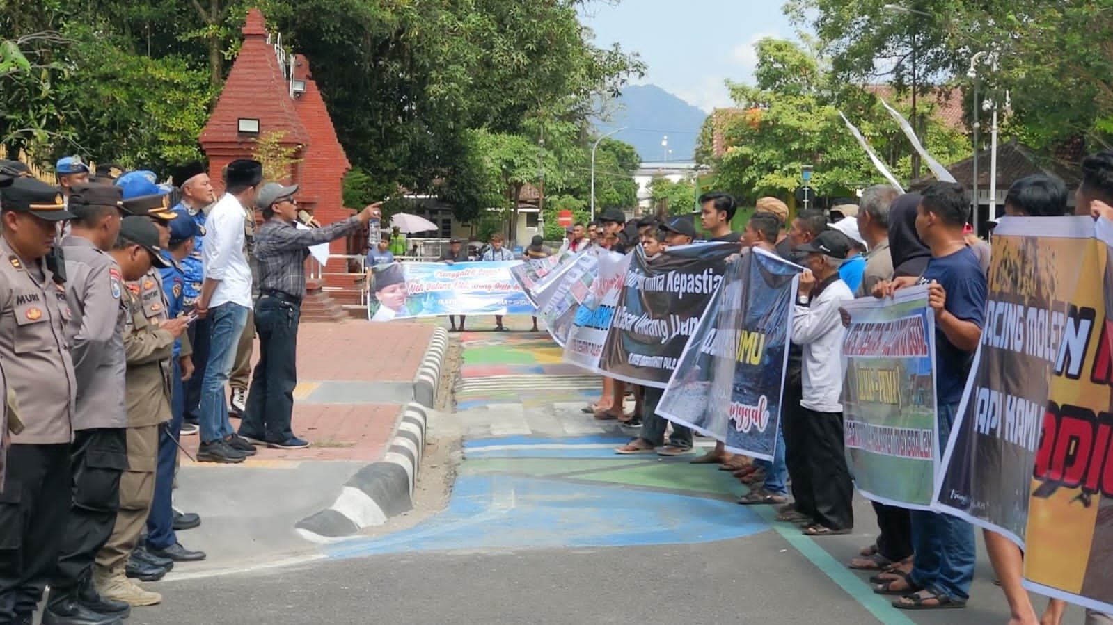 Ratusan warga Pule unjuk rasa di depan Pendopo Trenggalek. (Foto: Herlambang)