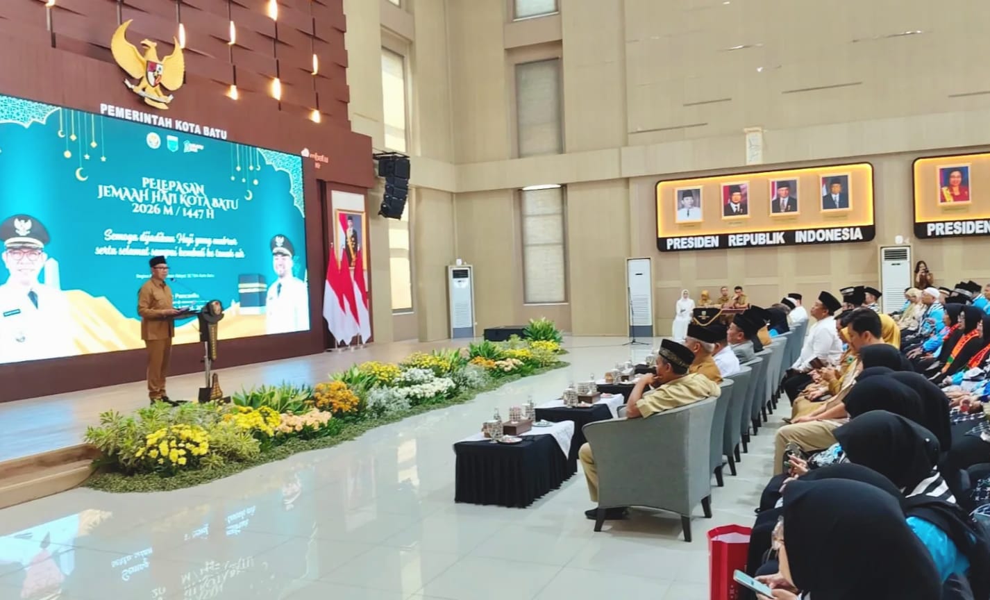 KabarBaik.co, Batu – Suasana khidmat menyelimuti Graha Pancasila Kota Batu, Senin (20/4). Ratusan calon jemaah haji larut dalam lantunan talbiyah, “Labbaikallahumma Labbaik, Labbaikala syarikalakala Labbaik…” yang dipimpin langsung oleh Wali Kota Batu, Nurochman.
