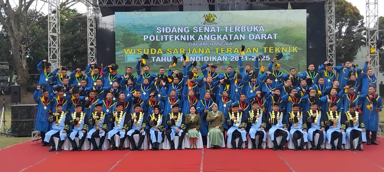 KabarBaik.co – Sebanyak 60 prajurit TNI Angkatan Darat resmi menyandang gelar Sarjana Terapan Teknik dalam Wisuda Diploma IV Angkatan VI Tahun Pendidikan 2021-2025 di Politeknik Angkatan Darat (Poltekad) Kodiklat TNI AD. Acara yang digelar di Kampus Poltekad, Desa Pendem, Kecamatan Junrejo, Kota Batu itu menjadi simbol keberhasilan TNI AD dalam membentuk prajurit yang tak hanya andal secara fisik, tapi juga unggul secara intelektual.