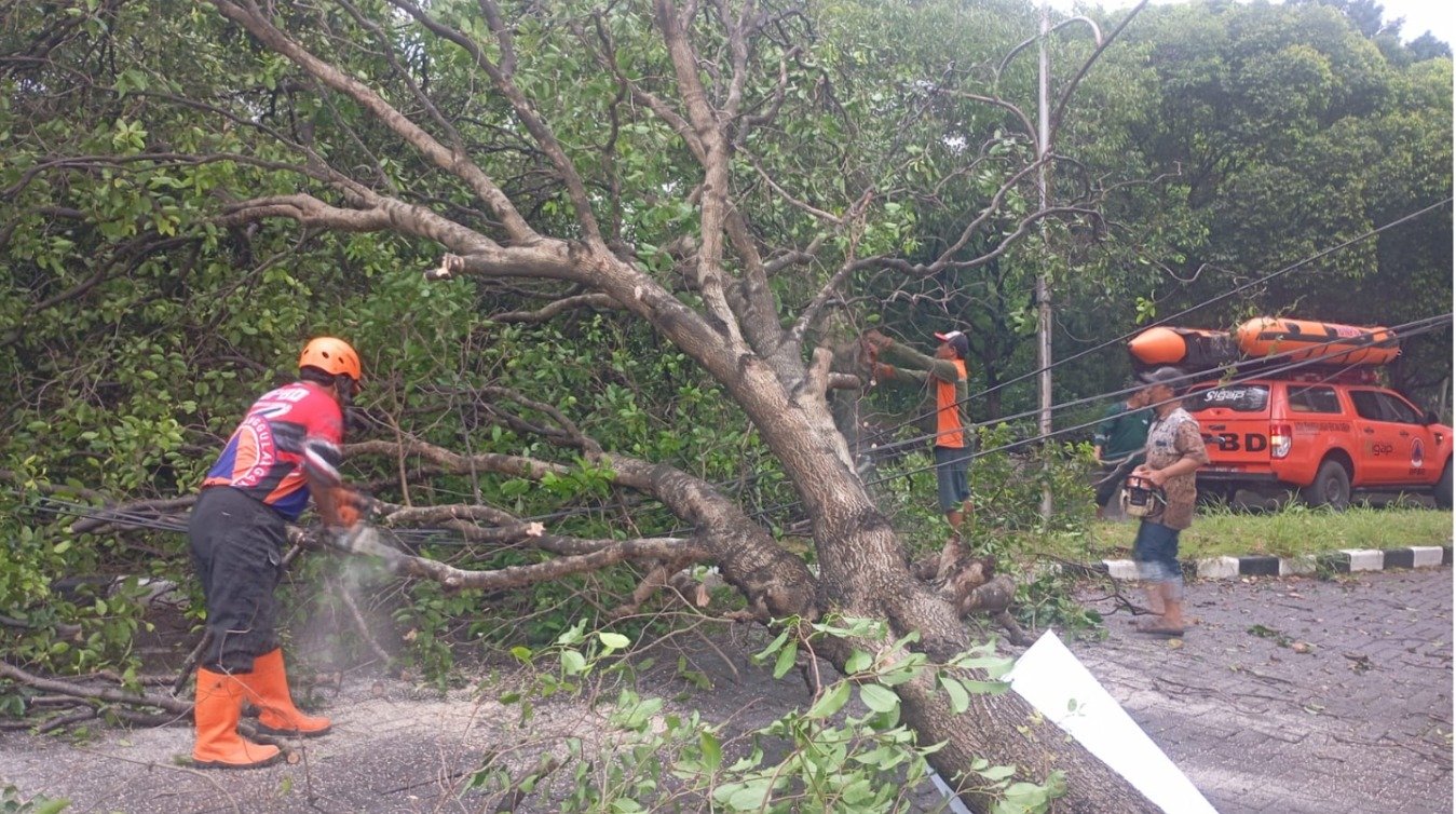Pohon tumbang dilaporkan di Taman Puri Indah, Desa Suko, Kecamatan Sidoarjo, serta di Jalan Taman Indah, Kelurahan Sepanjang, Kecamatan Taman.
