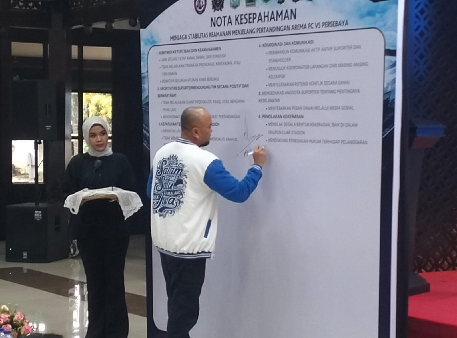 Dokumen tersebut diteken oleh perwakilan komunitas Aremania, koordinator lapangan, serta Presidium Aremania Utas, Ali Rifki, dengan disaksikan pimpinan kepolisian di Malang Raya.