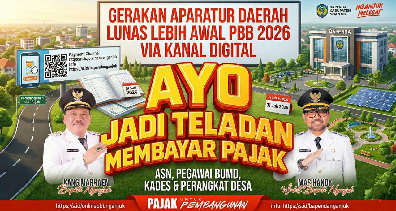 KabarBaik.co, Nganjuk – Pemkab Nganjuk melalui Badan Pendapatan Daerah (Bapenda) meluncurkan gerakan “Ayo Jadi Teladan Membayar Pajak”, yang ditujukan khusus kepada ASN, pegawai BUMD, Kepala Desa, dan Perangkat Desa se-Kabupaten Nganjuk untuk menjadi pelopor pelunasan Pajak Bumi dan Bangunan Perdesaan dan Perkotaan (PBB-P2) tahun anggaran 2026.