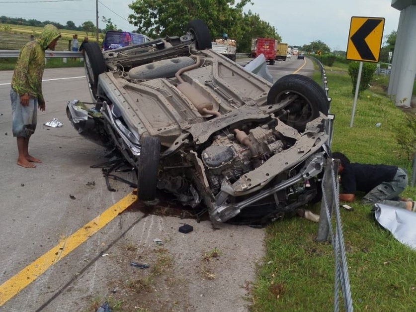 Benturan keras membuat Avanza terguling dan berhenti dalam posisi terbalik di lajur cepat dengan kondisi ringsek parah. Sementara truk bernopol D 8846 LC berhenti di bahu jalan menghadap ke timur.