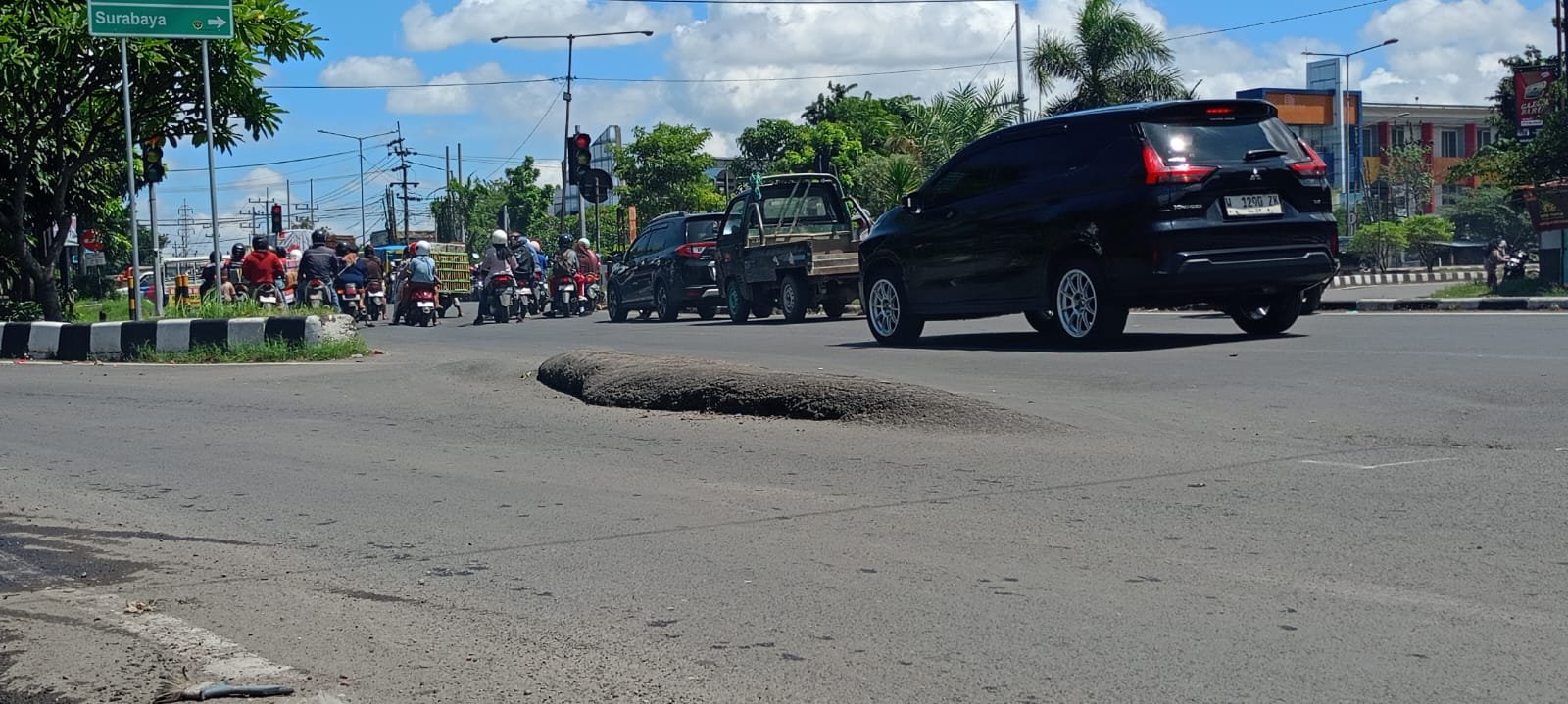 Kerusakan tersebut bukan berupa lubang atau permukaan jalan yang bergelombang, melainkan aspal yang menggembung membentuk gundukan. Diduga, kondisi ini terjadi akibat paparan panas matahari yang tinggi serta sering dilintasi kendaraan Over Dimension dan Over Loading (ODOL).