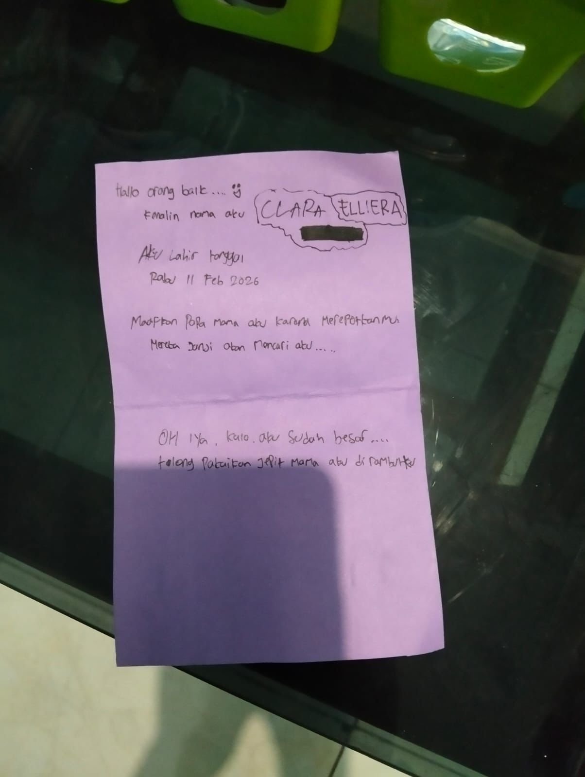 Bayi tersebut pertama kali ditemukan oleh pemilik rumah sekitar pukul 08.30 WIB. Saat diperiksa, selain bayi, terdapat juga sepucuk surat. Dalam surat tersebut tertulis nama bayi CE, tanggal lahir 11 Februari 2026, serta pesan permohonan maaf yang diduga dari orang tuanya.