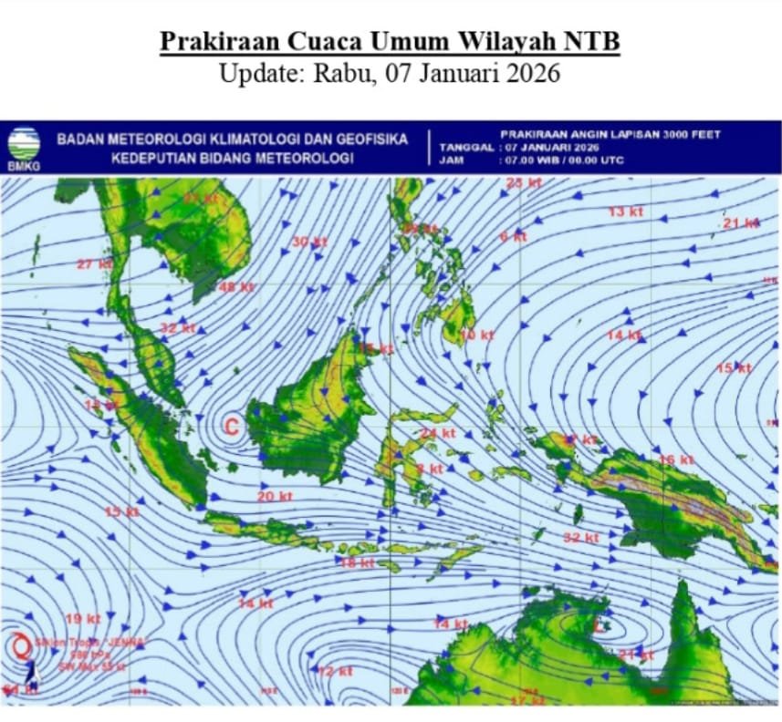 KabarBaik.co – Badan Meteorologi, Klimatologi, dan Geofisika (BMKG) mengeluarkan peringatan dini cuaca untuk wilayah Nusa Tenggara Barat (NTB), Selasa (7/1). Berdasarkan rilis resmi BMKG pada pukul 08.15 WITA, hujan sedang hingga lebat yang dapat disertai kilat/petir dan angin kencang berpotensi terjadi hampir di seluruh wilayah NTB.