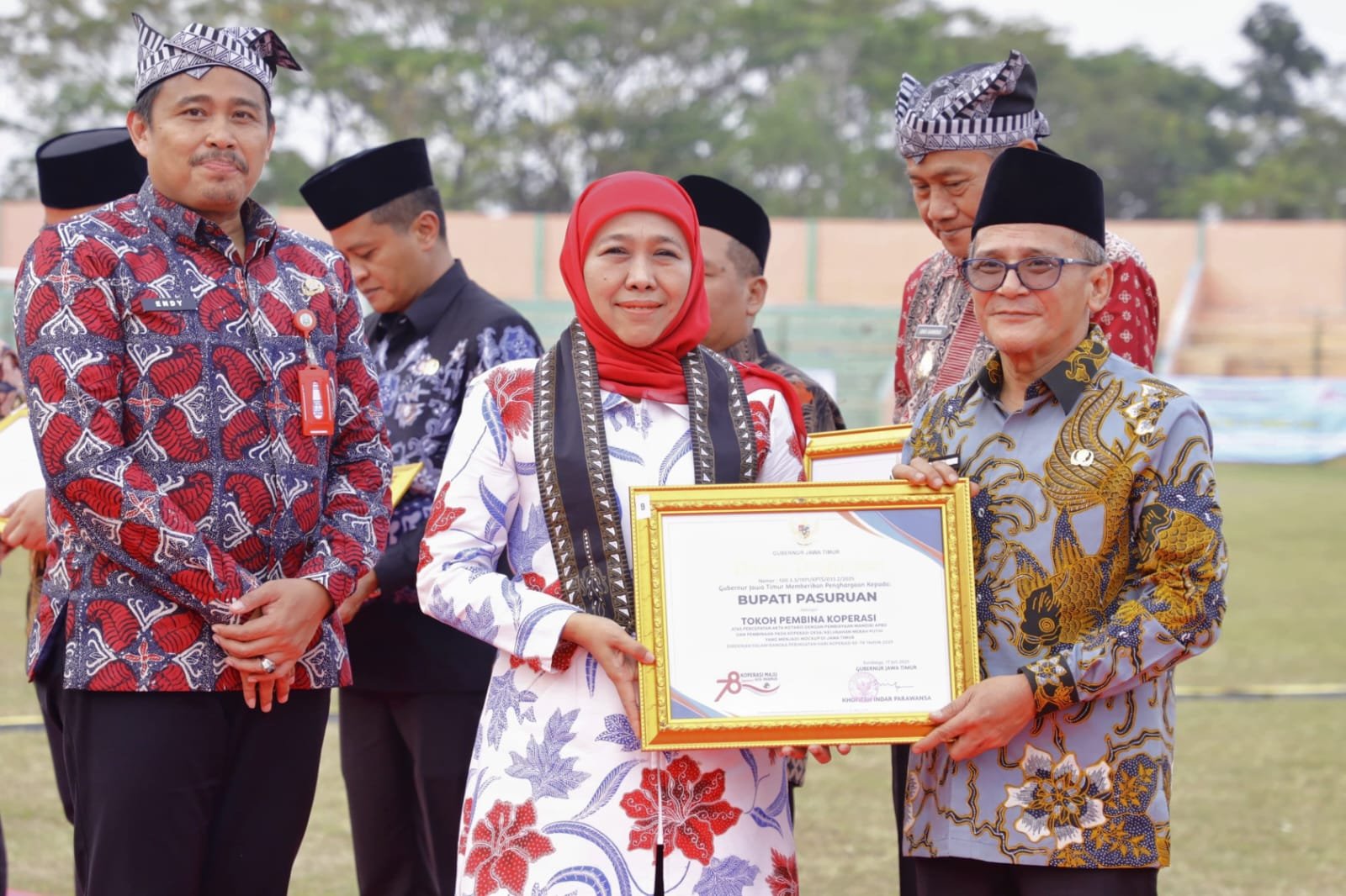 KabarBaik.co – Bupati Pasuruan, Rusdi Sutejo (Mas Rusdi) mendapatkan apresiasi dari Gubernur Jawa Timur, Khofifah Indar Parawansa, pada puncak peringatan Hari Koperasi ke-78 Provinsi Jawa Timur yang digelar di Stadion Letjend H. Soedirman Bojonegoro. Secara seremonial, piagam penghargaan diserahkan kepada Wakil Bupati Pasuruan Shobih Asrori.