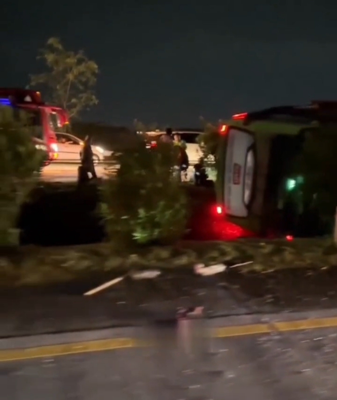 Salah satu saksi mata, Faizudin Hasan, 25, mengatakan saat dirinya melintas di lokasi, kondisi bus sudah dalam posisi terguling di median tengah jalan tol.