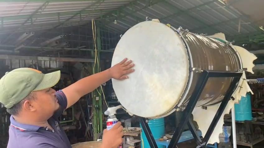 Setelah drum dibersihkan dan dipotong sesuai ukuran, bagian atasnya dipasangi kulit kambing jantan sebagai membran.
