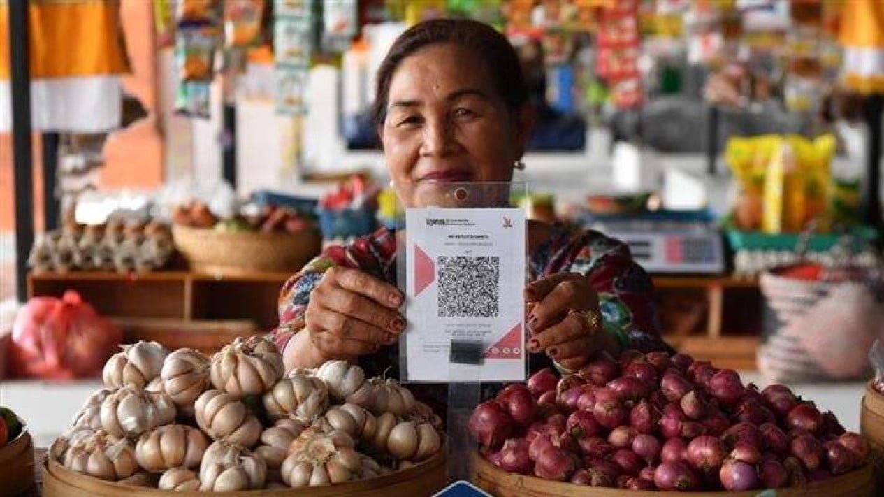 Mayoritas pedagang sayur dan kebutuhan dapur di pasar tradisional ini mulai beradaptasi dengan pembayaran digital melalui QRIS.