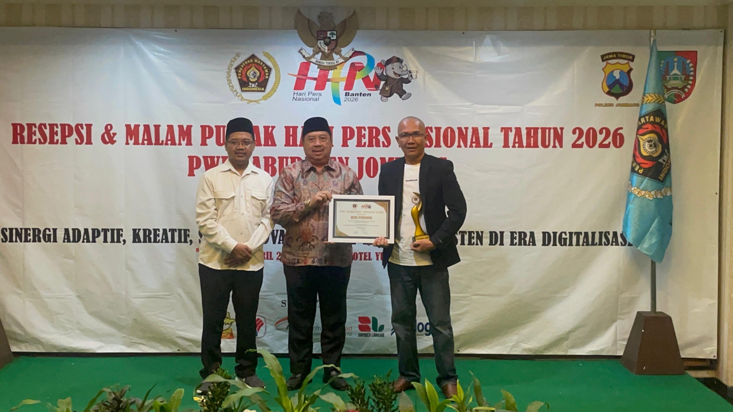 Heri Purnomo saat menerima piagam penghargaan ajang PWI Jombang Award 2026 (Teguh Setiawan)