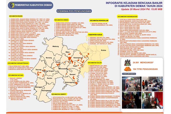 Sejuah ini, banjir di Kabupaten Demak belum surut. Tidak hanya sekolah, permukiman, dan area persawahan. Banjir juga manyasar perkantoran dan kawasan wisata. Termasuk kompleks makam Wali Songo Sunan Kalijaga di Kadilangu dan pelataran Masjid Agung Demak. (*)