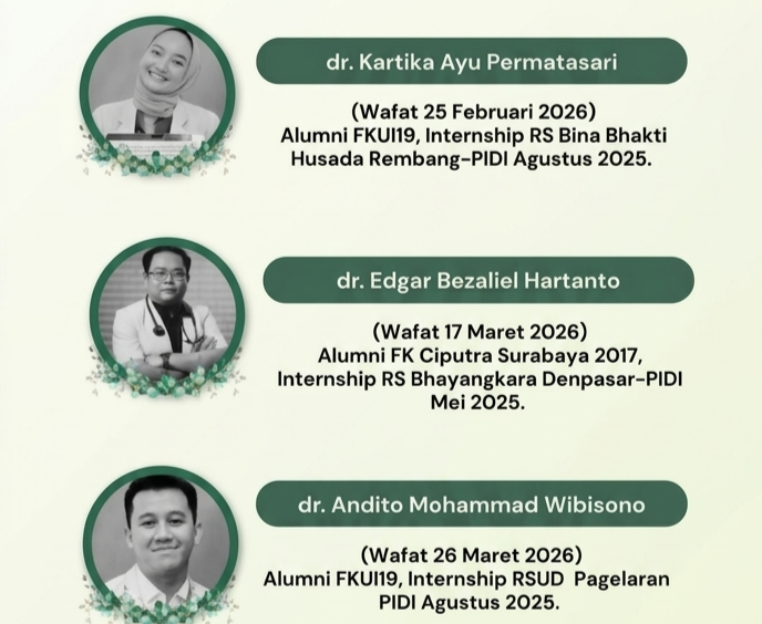 Pada Februari-Maret 2026 lalu, Indonesia kehilangan tiga dokter yang sedang menjalani Program Internship Dokter Indonesia (PIDI). Yakni, dr Kartika Ayu Permatasari, alumni Fakultas Kedokteran Universitas Indonesia (UI) angkatan 2019, berpulang pada 25 Februari 2026 saat bertugas di RS Bina Bhakti Husada Rembang. Ia dilaporkan meninggal dunia akibat komplikasi infeksi campak yang menyerang sistem pernapasan.