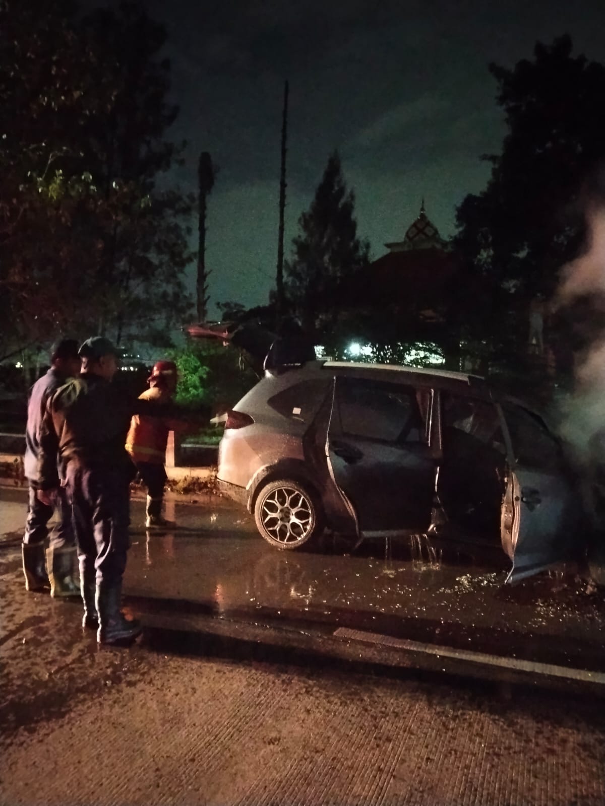 Saat tiba, api masih menyala di bagian depan kendaraan tepatnya di areal mesin. Asap tebal membumbung dari ruang mesin, sehingga petugas segera melakukan penyemprotan dan pendinginan untuk mencegah api merambat ke seluruh bodi mobil.