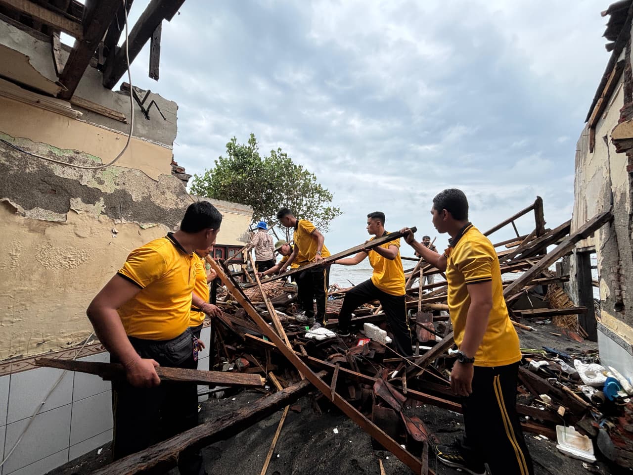 Kombes Pol Boyke F.S. Samola bersama seluruh personel Ditpolairud Polda NTB bersama instansi terkait Kota Mataram bahu-membahu membersihkan puing-puing rumah warga, perabotan yang rusak, serta membantu membersihkan Puing Puing permukiman nelayan.
