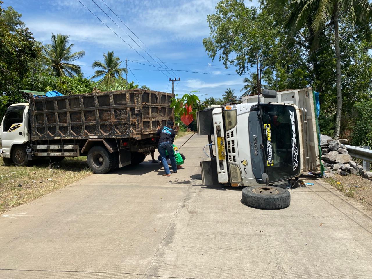 Dalam proses pelarian tersebut, ban belakang dump truk pecah sehingga kendaraan menjadi tidak stabil dan mengalami kecelakaan tunggal dengan terguling ke tepi jalan di wilayah Desa Sumberagung.