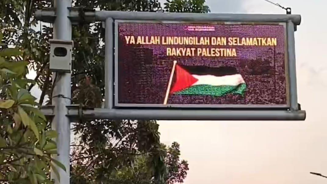 Papan VMS yang terpasang di jalan nasional sebagai bentuk dukungan warga dan Pemerintah Kabupaten Bojonegoro terhadap kemerdekaan Palestina. (Foto: Shohibul Umam)