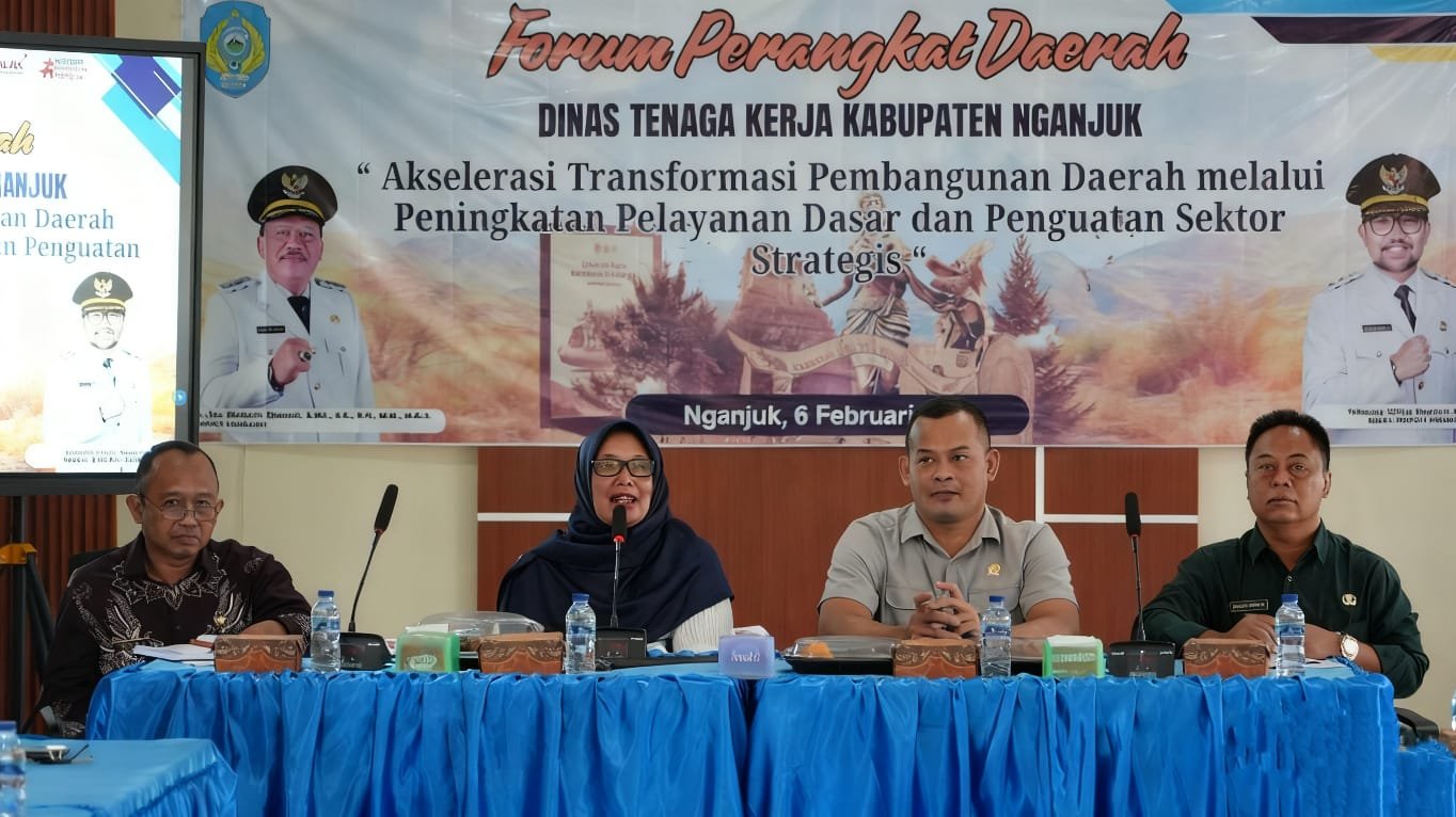 Kegiatan bertema ‘Akselerasi Transformasi Pembangunan Daerah melalui Peningkatan Pelayanan Dasar dan Penguatan Sektor Strategis’ yang digelar di Aula Disnaker Sabtu (7/2) dihadiri oleh berbagai pemangku kepentingan, antara lain Anggota Komisi IV DPRD Nganjuk, Kepala Disnaker Itsna Shofiani, dan perwakilan Bappeda.