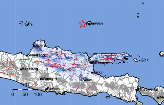 Gempa Bawean ini berkedalaman 3 km. Gempa dirasakan (MMI) III Tuban, III Bawean. (*)