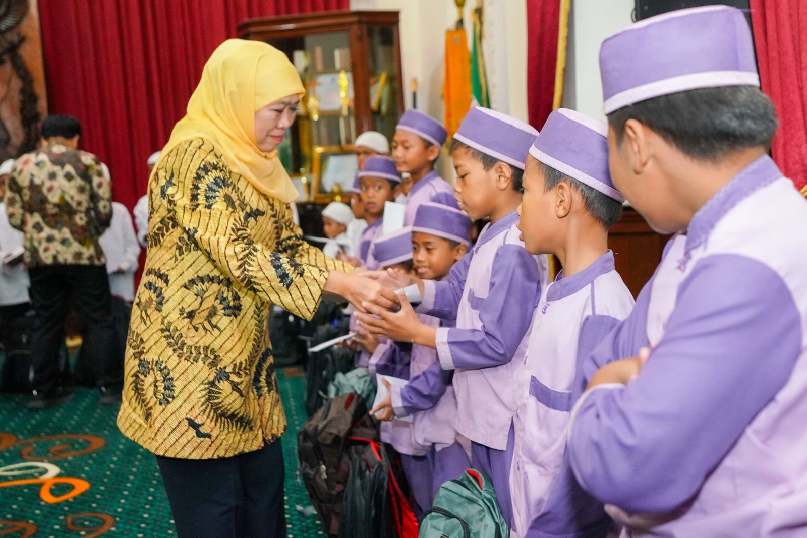 KabarBaik.co, Surabaya – Genap satu tahun kepemimpinan periode 2025–2030, Gubernur Jatim Khofifah Indar Parawansa bersama Wakil Gubernur Emil Elestianto Dardak menyantuni anak yatim dan pengemudi ojek online (ojol) di Gedung Negara Grahadi, Surabaya, Jumat (20/2).