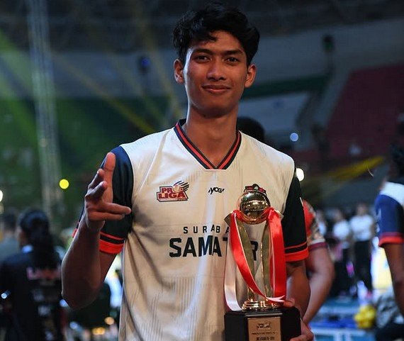 KabarBaik.co, Surabaya,- Suara sepatu berdecit di lantai taraflex, teriakan penonton memantul dari tribun, dan bola melayang tinggi menuju sisi kanan net. Dalam sepersekian detik, seorang pemuda bertubuh jangkung melompat, menggantung lebih lama dari yang lain, lalu menghantam bola sekuat tenaga. Blok lawan terlambat menutup. Jleb! Dan, poin.