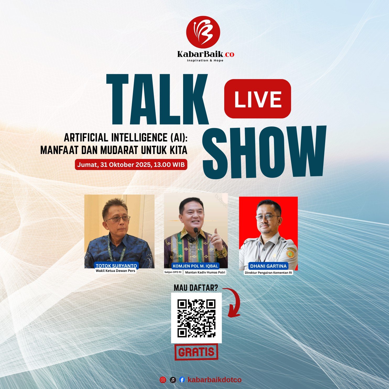 Talk show itu menjadi satu rangkaian Anniversary 2 Tahun KabarBaik.co, bertempat di Wizz Luxe Hotel Spazio, Surabaya, pada Jumat, 31 Oktober 2025, pukul 13.00 WIB. Karena tempat terbatas, maka peserta yang berminat untuk mengikuti talk show tersebut dibatasi. ‘’Tidak dipungut biaya. Malah dapat souvenir menarik,” ujarnya. Yang berminat, cukup mendaftar online melalui link ini: https://forms.gle/d7QjhBKhWPKfjf5D6 atau scan barcode yang tersedia di foto.