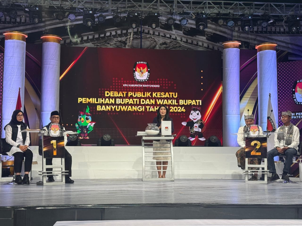 KabarBaik.co – Debat pertama Pilkada Banyuwangi yang digelar Komisi Pemilihan Umum (KPU) rampung digelar pada Minggu (27/10). Debat perdana antara pasangan nomor urut 1 Ipuk Fiestiandani – Mujiono dengan pasangan nomor urut 2 Ali Makki – Ali Ruchi itu mengangkat tema Memajukan Daerah dan Meningkatkan Kesejahteraan Masyarakat Banyuwangi.