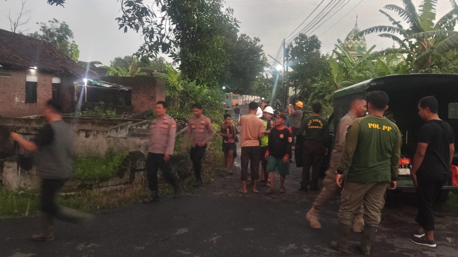 Petugas gabungan dari BPBD Sidoarjo, Polsek Prambon, Koramil, Satpol PP, dan Linmas bergerak cepat melakukan evakuasi, pemotongan pohon, dan pendataan kerusakan. Warga juga turut bergotong royong membersihkan material yang berserakan.