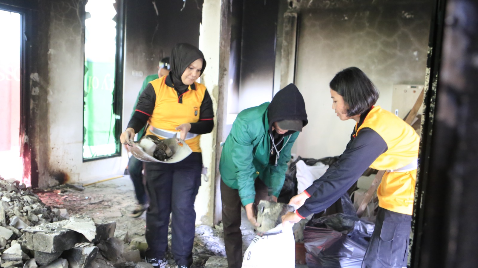 Para polwan bersih-bersih pos polisi yang rusak akibat aksi anarkis