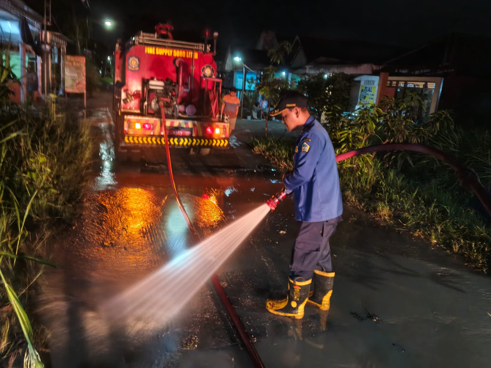 Penyemprotan ini dilakukan setelah warga melaporkan kondisi jalan yang membahayakan akibat ceceran tanah dari aktivitas proyek pengurukan KDMP yang melintas di kawasan tersebut.