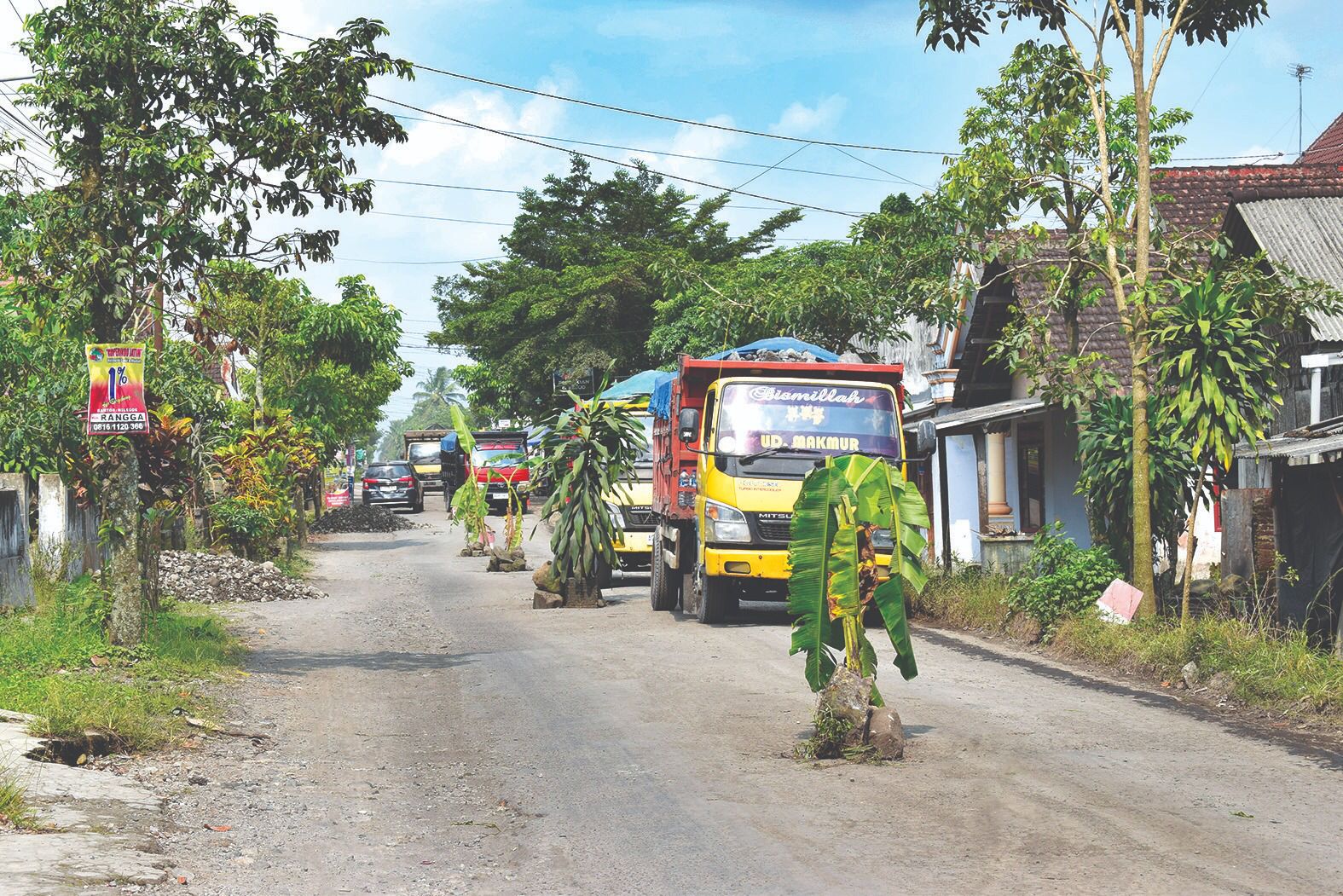 Aksi itu muncul setelah keluhan soal jalan rusak tak kunjung membuahkan hasil. Sepanjang sekitar 550 meter, mulai depan SMPN 2 Garum hingga Kantor Desa Karangrejo, jalan dipenuhi tanaman pisang yang ditancapkan warga.