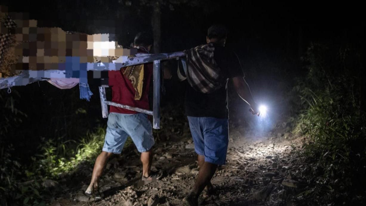 Dalam kondisi gelap gulita tanpa penerangan, keluarga dan warga setempat bergantian memanggul jenazah melewati jalan tanah yang licin dan berlumpur. Ambulans yang semula mengantar dari rumah sakit tak mampu melanjutkan perjalanan karena kondisi jalan yang tak bisa dilalui kendaraan.