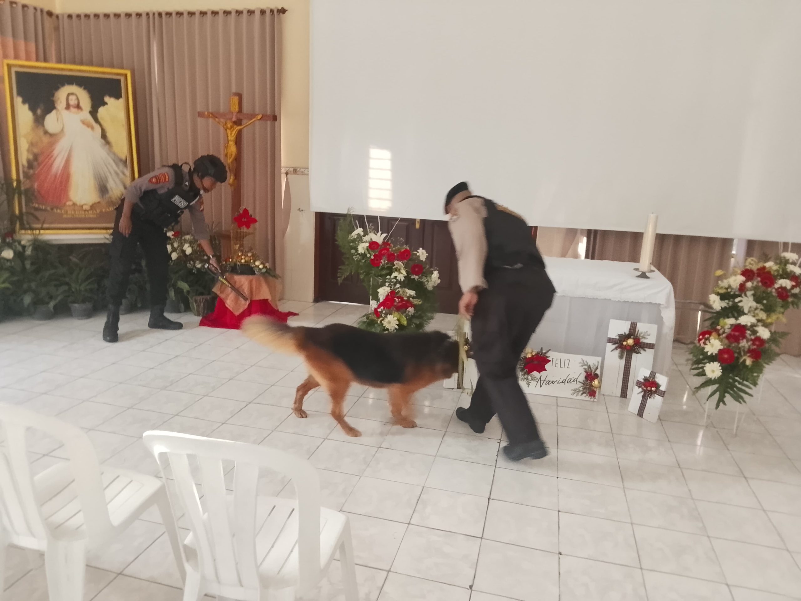Sterilisasi gereja dilakukan oleh tim Satuan Samapta dengan melibatkan anjing pelacak milik Unit K9 Polres Jombang.