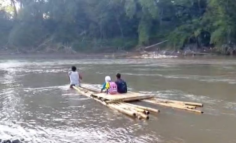 Anak sekolah saat menaiki rakit menyeberangi sungai. (Ist)