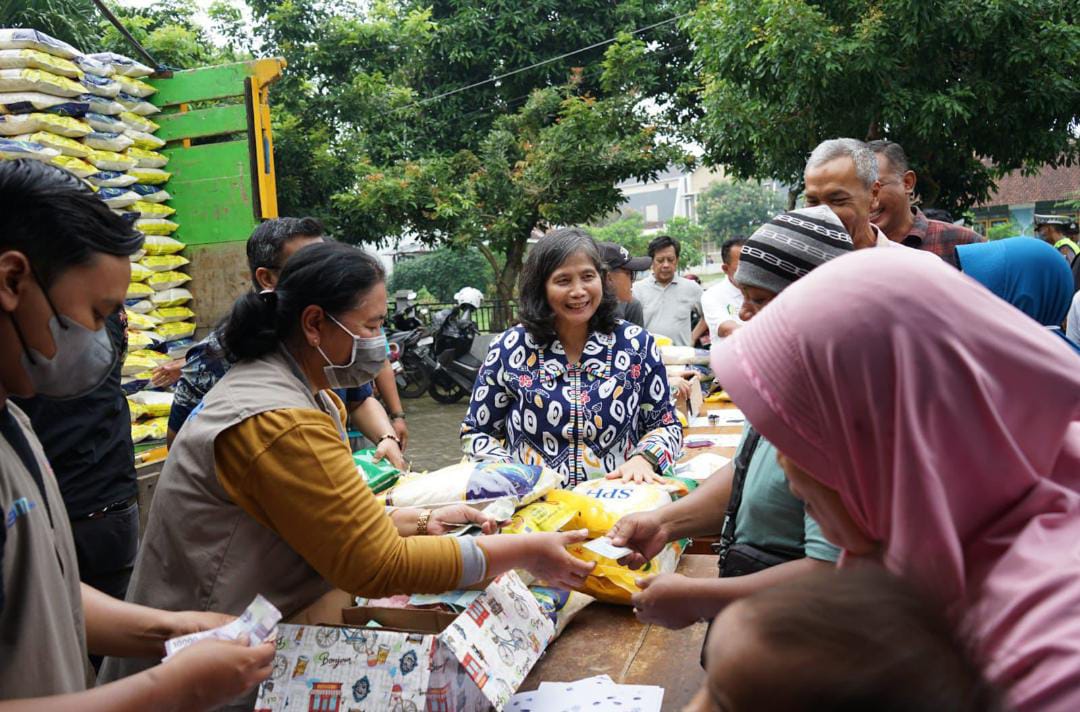 Pj Wali Kota Kediri Zanariah saat mengikuti salah satu upaya mengatasi kemiskinan dengan pasar murah. (Foto: Oktavian Yogi Pratama)