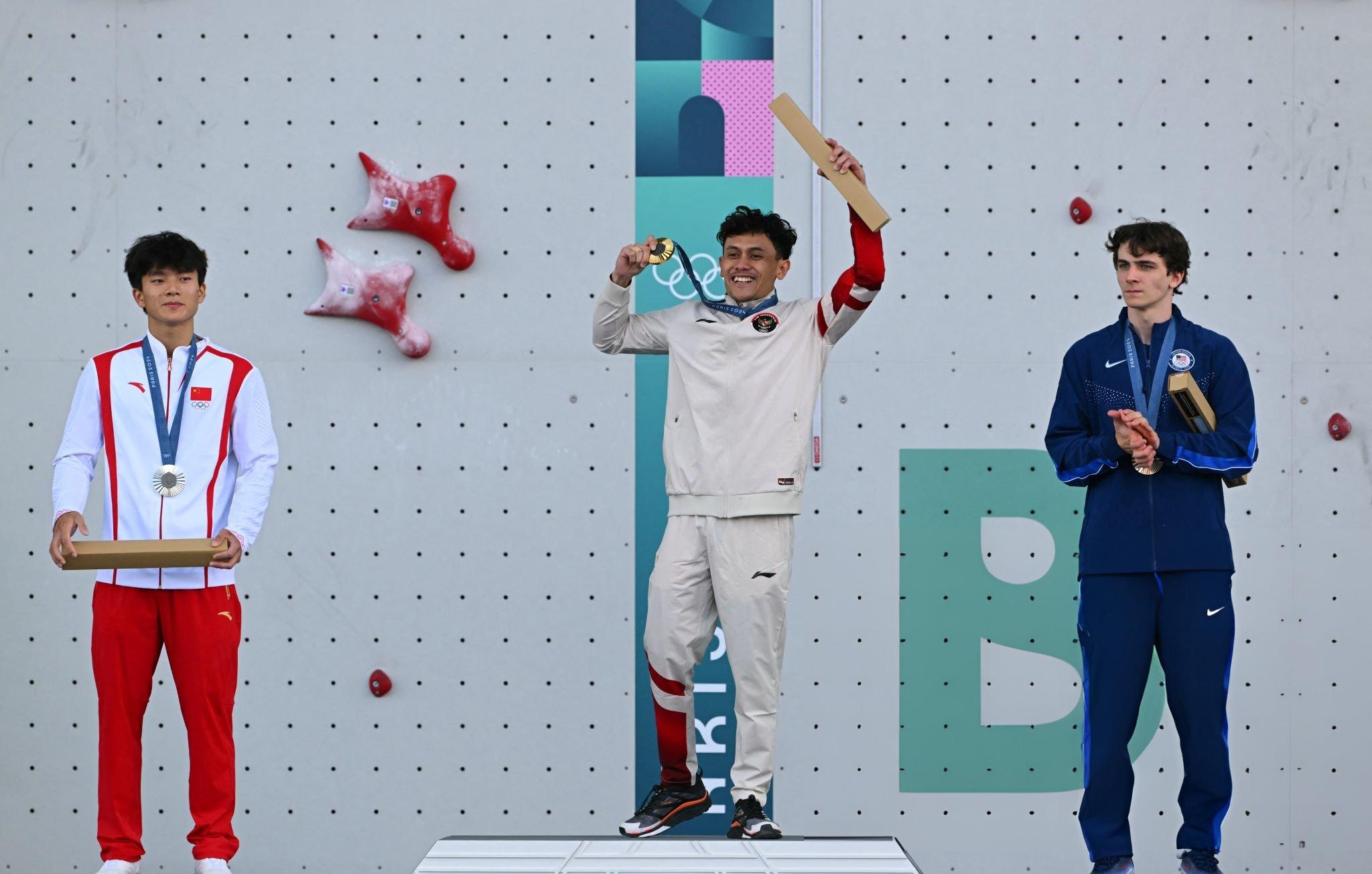 Ekspresi climber putra andalan Indonesia Veddriq Leonardo (tengah) yang mempersembahkan medali emas pada ajang Olimpiade Paris 2024. (Foto: istimewa/Getty Images)