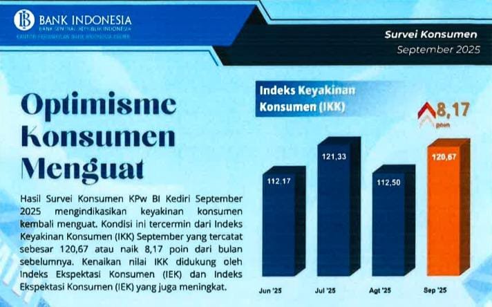 KabarBaik.co – Optimisme masyarakat Kediri terhadap kondisi ekonomi kian menguat. Hal itu tergambar dari hasil Survei Konsumen Bank Indonesia bulan September 2025 yang mencatat Indeks Keyakinan Konsumen (IKK) mencapai 120,67—berada di atas level optimis (>100) dan naik dibanding bulan sebelumnya.