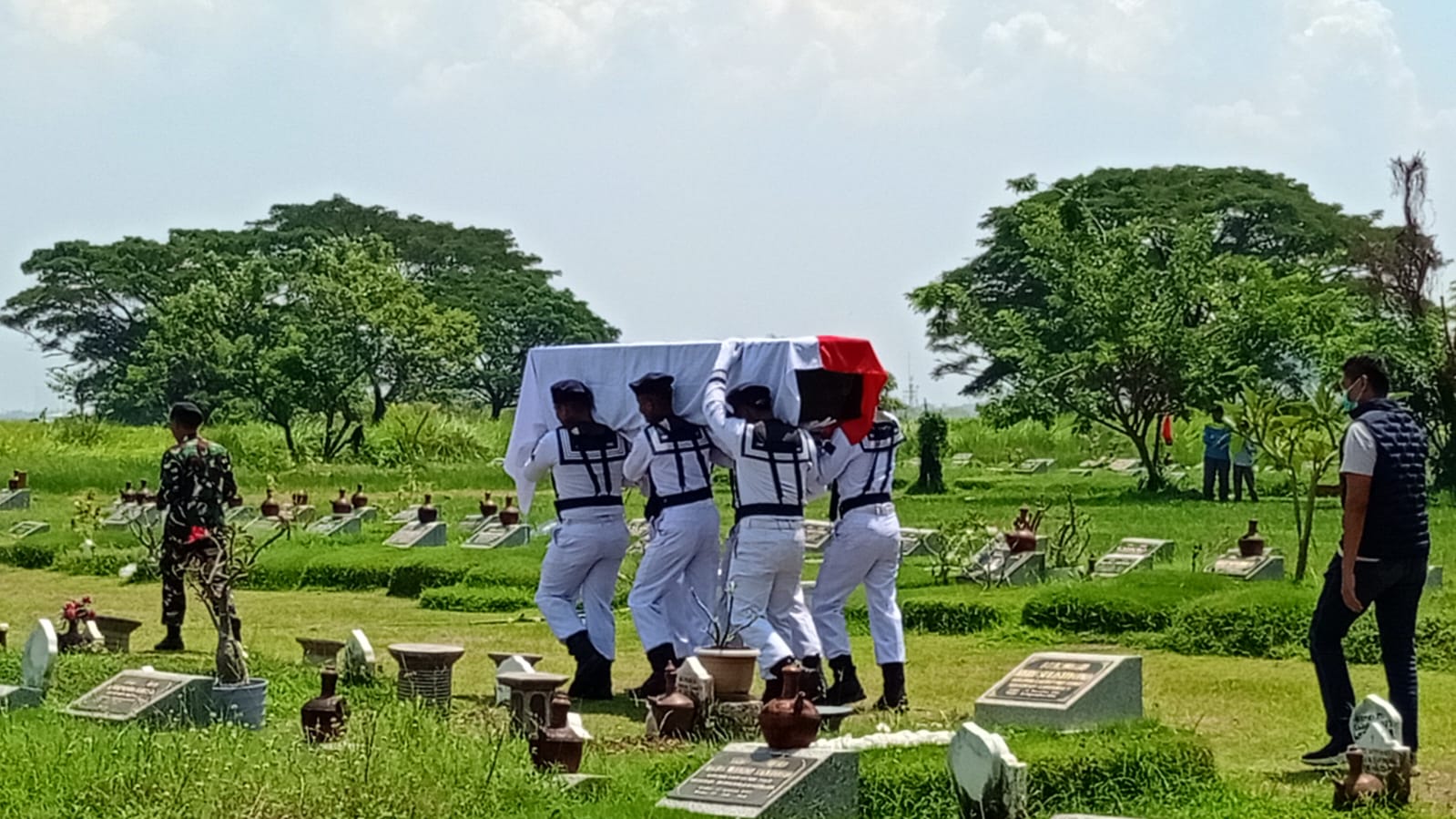 Suasana haru menyelimuti prosesi pemakaman yang digelar pada Sabtu (18/4) di makam warga TNI Angkatan Laut wilayah timur Juanda, Gisikcemandi, Kecamatan Sedati, Sidoarjo. Isak tangis keluarga pecah saat jenazah almarhum dimakamkan dengan upacara militer.