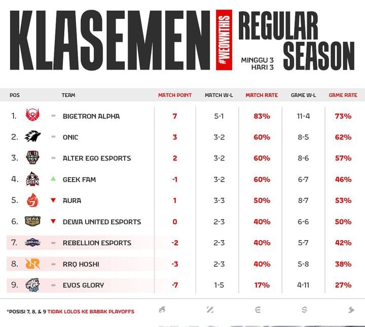 Bigetron Alpha = 7 point ONIC Esports = 3 point Alter Ego = 2 point Geek Fam = -1 point AURA=1 point Dewa United = 0 point Rebellion = -2 point RRQ Hoshi = -3 point EVOS Glory = -7 point