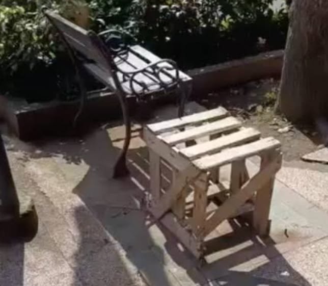 Dalam video yang diunggah pada Kamis (12/2), terlihat bekas dudukan kursi masih menyisakan baut yang tertanam di lantai pedestrian. Namun, kursi besi yang sebelumnya terpasang permanen di depan salah satu kafe itu sudah tidak ada dan posisinya diganti menggunakan palet kayu yang diduga dipasang oleh pelaku.