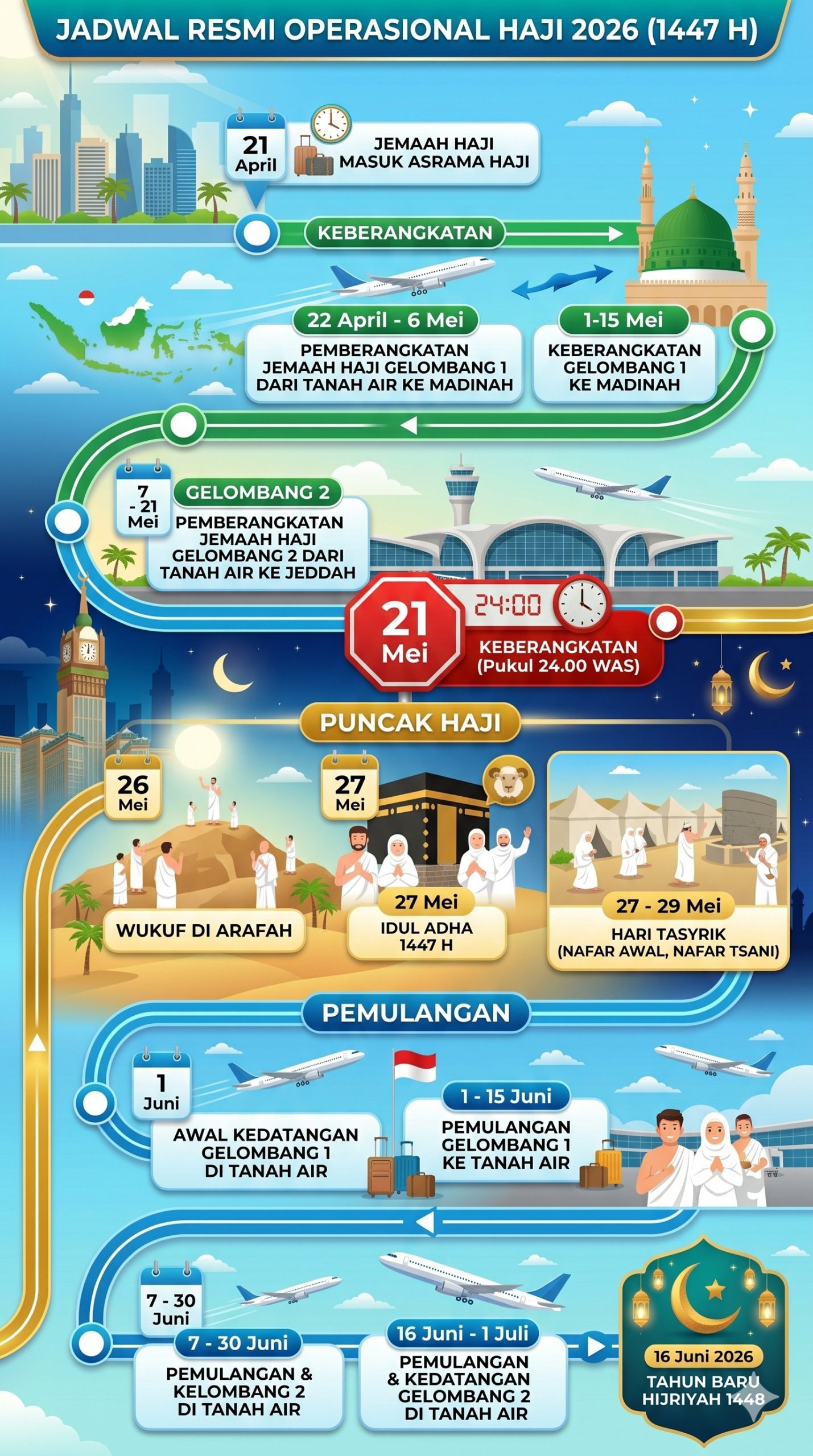 KabarBaik.co, Surabaya- “Labbaik Allahumma labbaik, labbaika laa syarika laka labbaik…” seruan talbiyah itu seakan mengiringi langkah ratusan ribu calon jemaah haji (CJH) Indonesia yang hari ini, Rabu, 21 April 2026, mulai memasuki Asrama Haji.