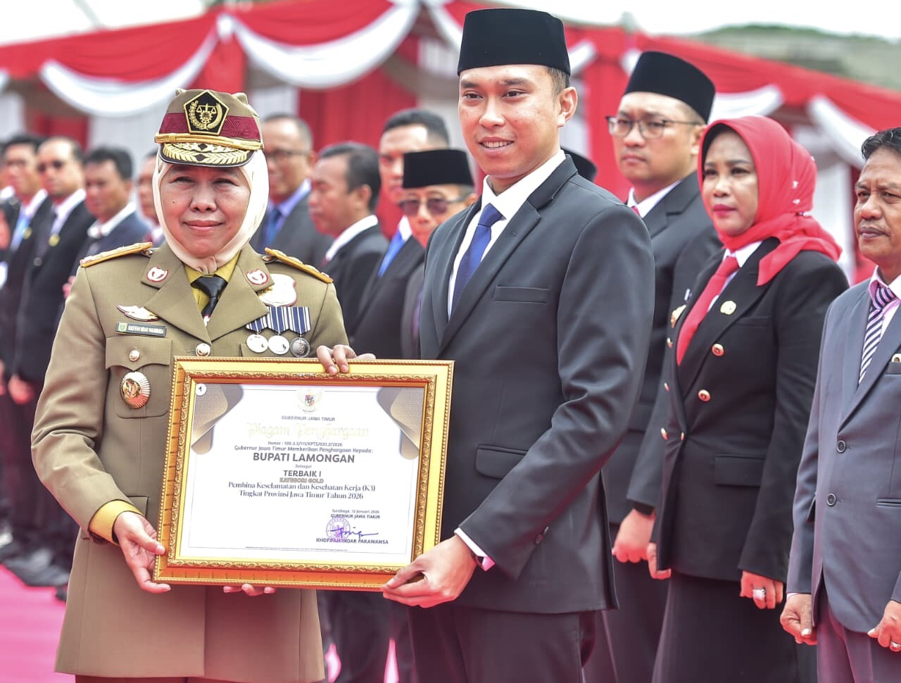 Penghargaan tersebut diterima langsung oleh Wakil Bupati Lamongan Dirham Akbar Aksara pada Apel Bulan Keselamatan dan Kesehatan Kerja Nasional 2026 yang digelar di Stadion Petrokimia Gresik, Rabu (14/1) lalu. Penghargaan diserahkan oleh Gubernur Jawa Timur Khofifah Indar Parawansa.
