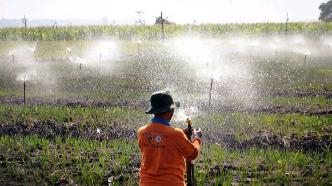Sebagai langkah konkret, Pemkab Nganjuk mendorong penerapan sistem irigasi sprinkler di lahan pertanian. Teknologi ini menyiram tanaman secara otomatis dengan pola menyerupai hujan, sehingga air terdistribusi merata dan sesuai kebutuhan tanpa merusak struktur tanah.