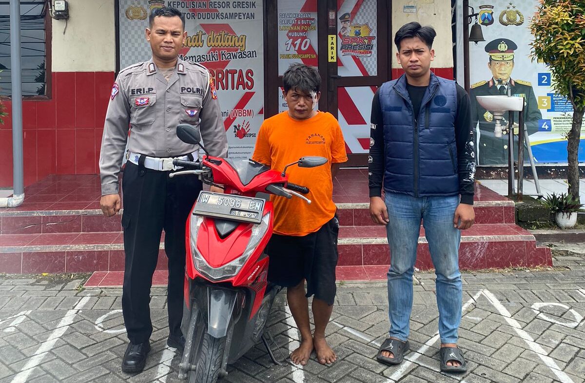 Warga kemudian menghubungi Polsek Duduksampeyan. Petugas yang datang ke lokasi langsung mengamankan pelaku beserta barang bukti satu unit sepeda motor Honda Beat lengkap dengan kunci kontak dan STNK asli.