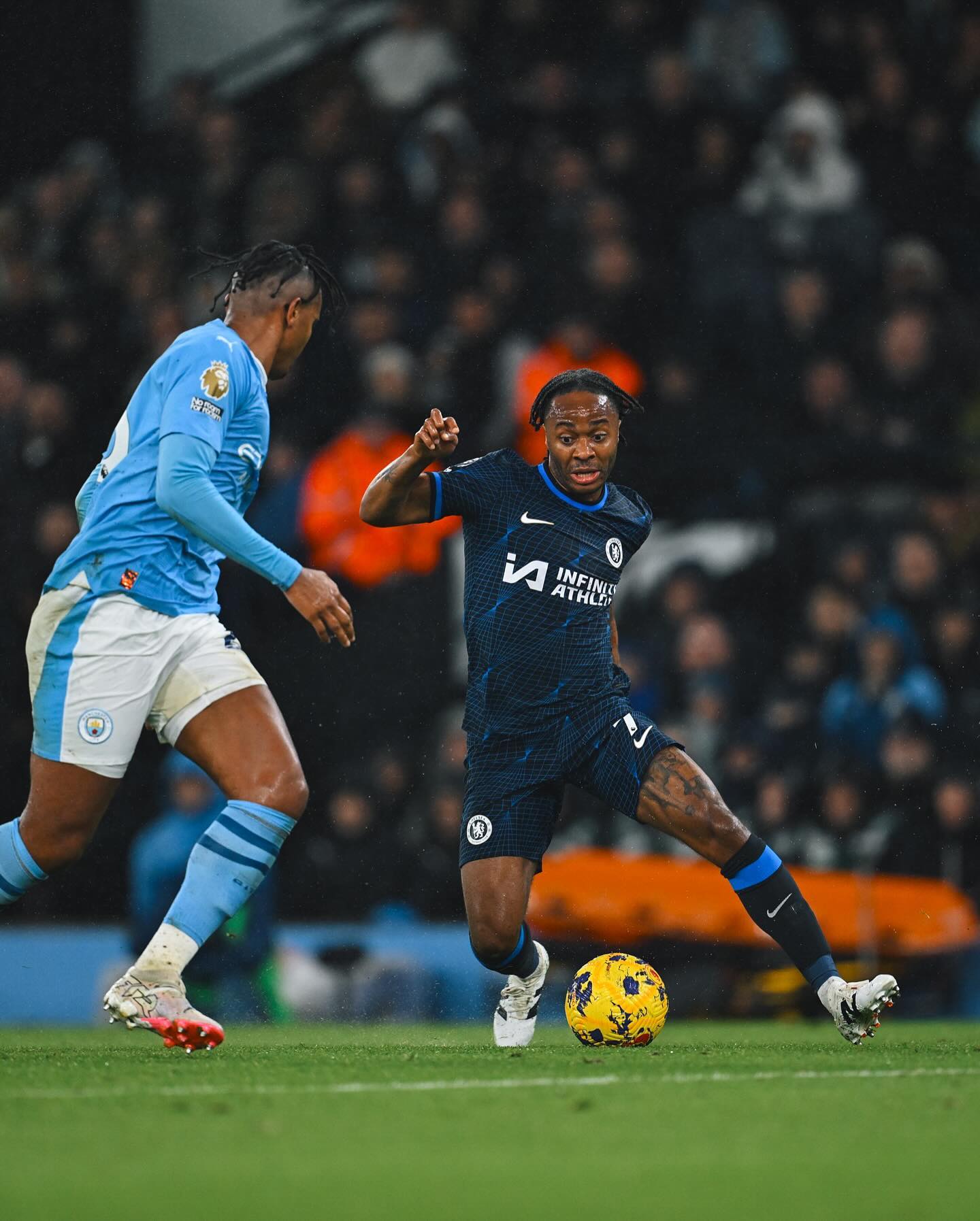 Raheem Sterling (kanan) mencoba melewati adangan pemain Manchester City pada laga pekan ke-25 di Etihad Stadium, Minggu (18/2/2024) dini hari tadi WIB. Pertandingan ini berakhir sama kuat dengan skor 1-1. (Instagram/Chelsea)