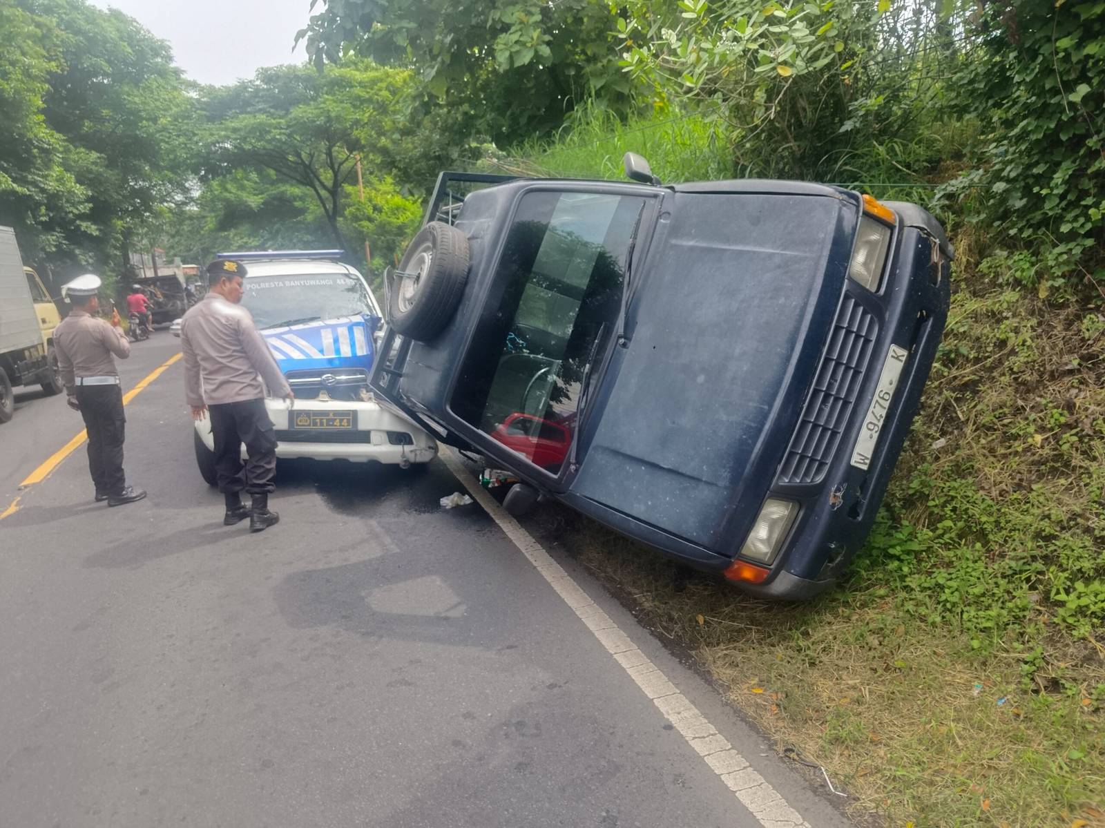 Kecelakaan itu melibatkan sebuah mobil patroli Satlantas Polresta Banyuwangi dan mobil pick up bernopol W 9476 K. Tidak ada korban jiwa dalam kecelakaan itu, hanya saja karena tabrakan, mobil patroli ringsek di bagian depan sementara mobil pick up nyaris terbalik.