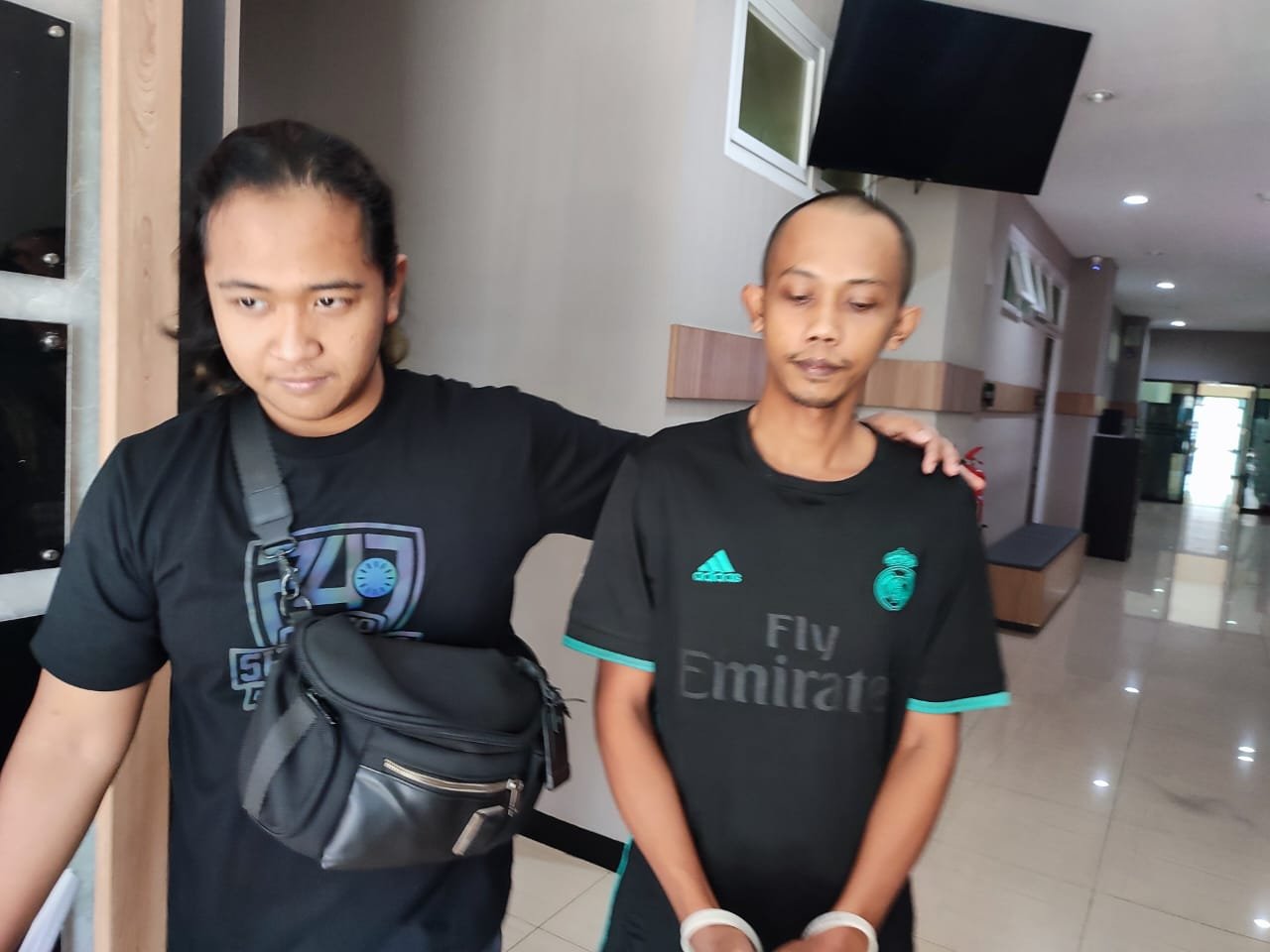 Ristyo Ari Wijayanto (kanan) digelandang petugas di Mapolres Gresik. (Foto: Andika DP)