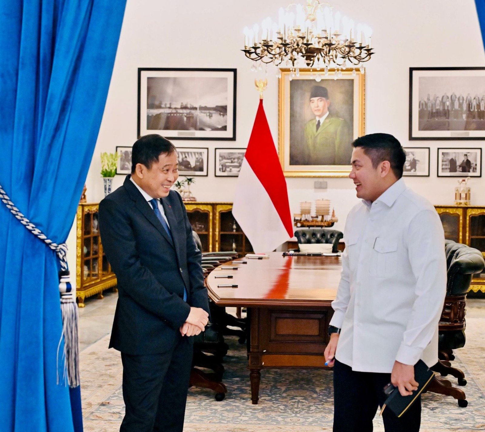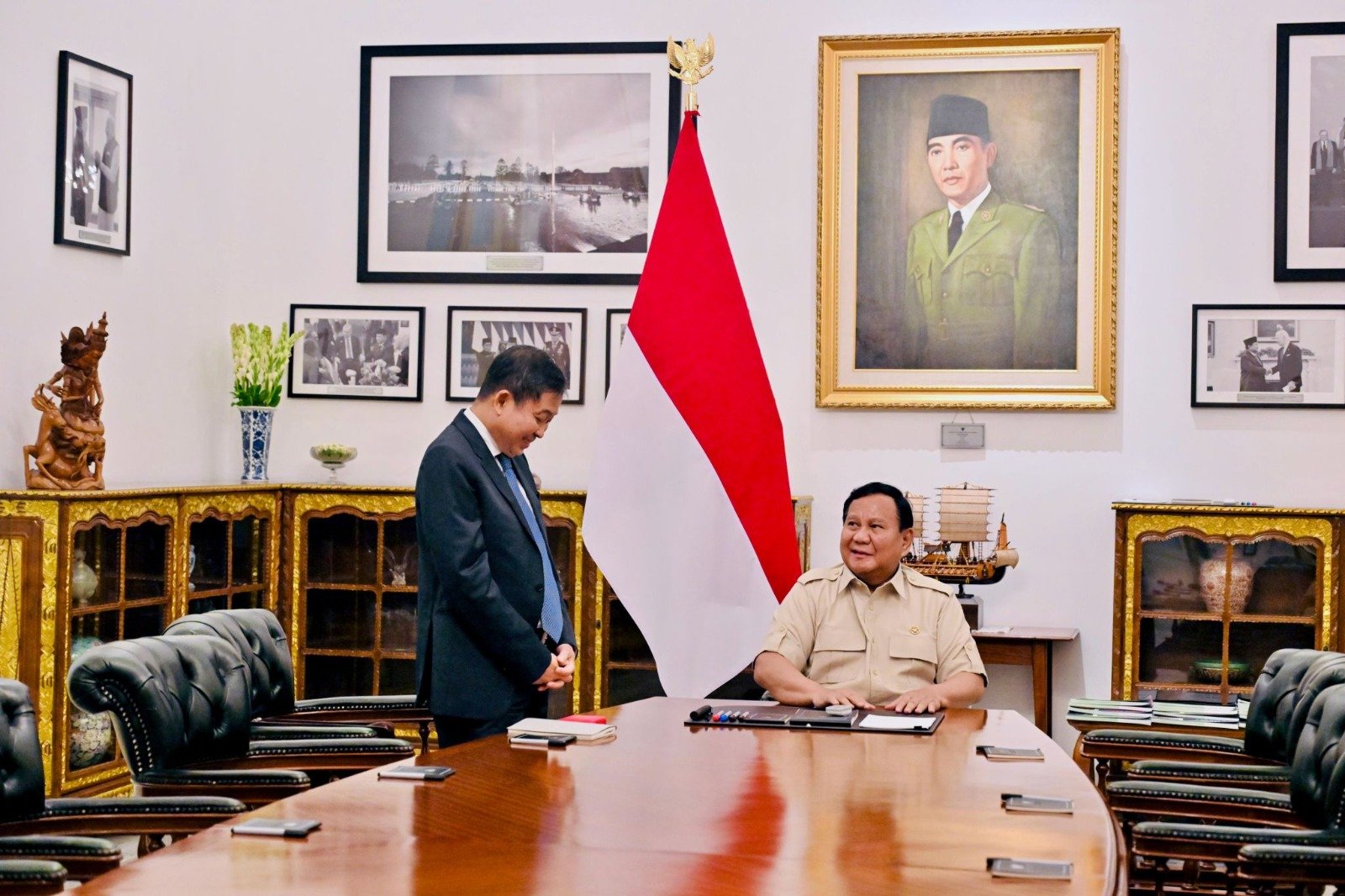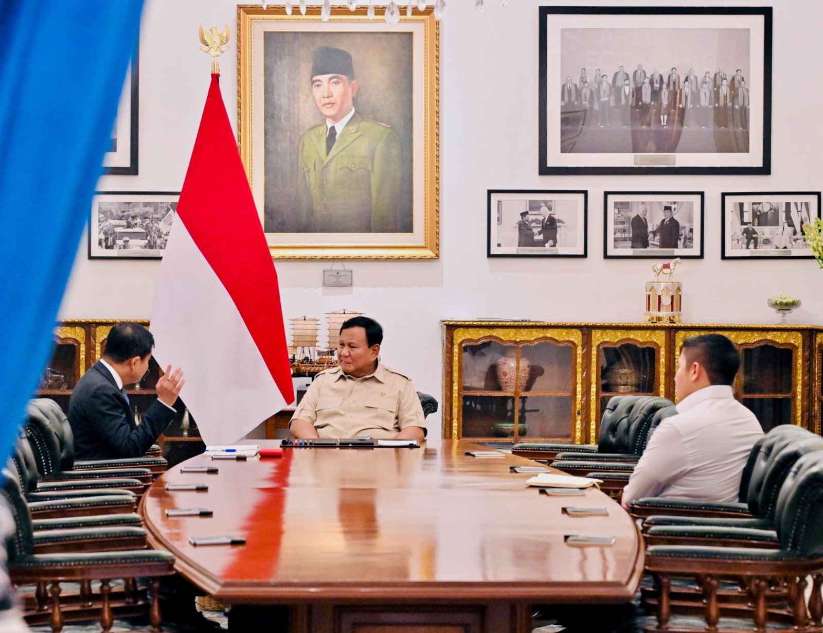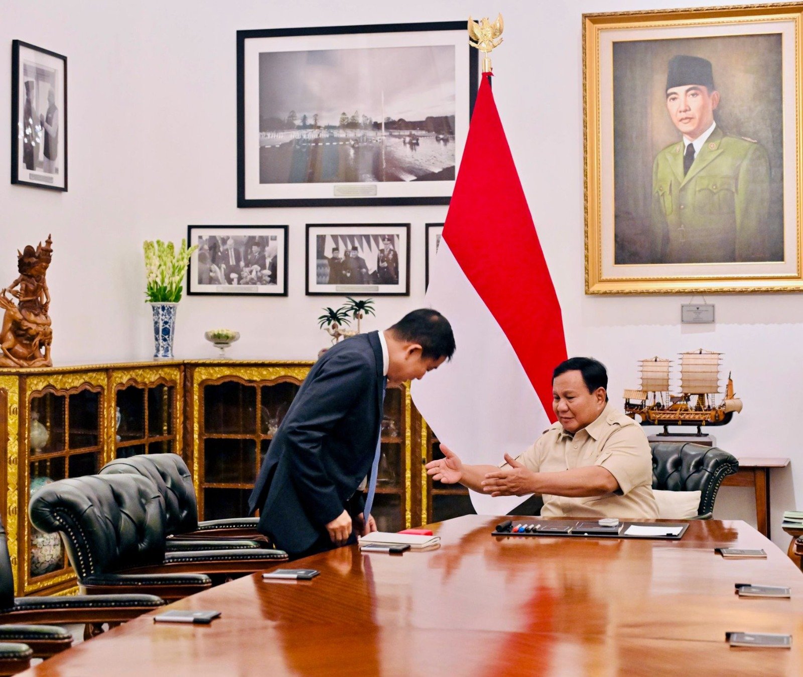 Presiden Prabowo Subianto menerima kunjungan Menteri Perhubungan RI 2014-2016 Ignasius Jonan di Istana Merdeka, Jakarta, pada Senin (3/11). Pertemuan yang berlangsung selama kurang lebih dua jam tersebut diinisiasi oleh Sekretaris Kabinet Teddy Indra Wijaya dan diwarnai dengan diskusi hangat mengenai berbagai program pemerintah, khususnya yang berorientasi pada kesejahteraan rakyat.