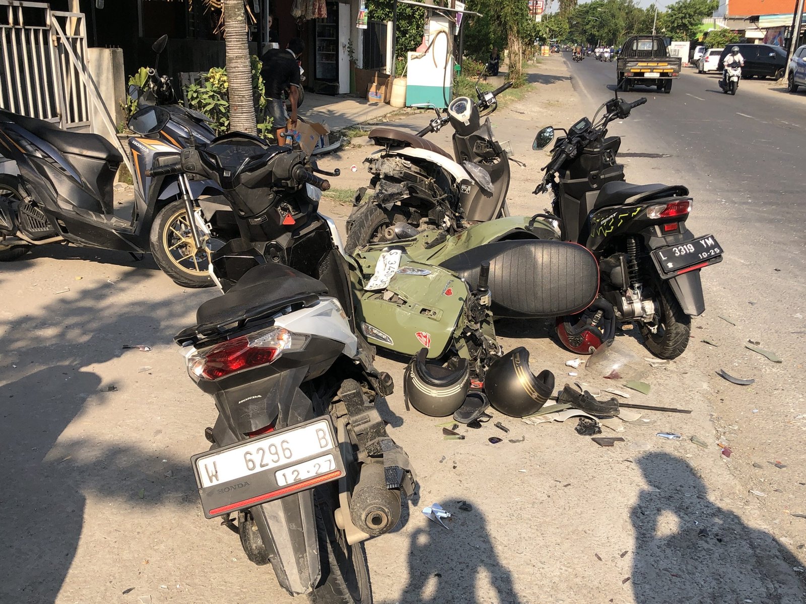 Akibatnya, mobil boks menabrak lima sepeda motor yang melaju dari arah berlawanan. Yakni Honda Scoopy W-2383-EX, Honda Beat L-3319-YM, Honda Vespa S-3450-JCF, Honda Vario W-6296-B dan Honda Vario W-5737-EO.